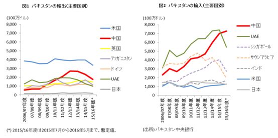 パキスタンにおける中国の勢いは、すさまじい。2014/15年度(パキスタンの年度は7月~翌年6月)の中国との貿易総額は93億ドル。8年前の2006/07年度と比べて3.3倍になった。貿易相手国としては、アラブ首長国連邦(UAE)を引き離して首位。直近の15年7月~16年5月の合計では、中国は輸出相手国としては2位だが、輸入相手国としては1位に躍進した。