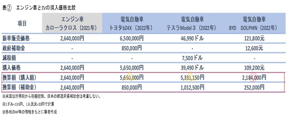 200万円台で購入可能なエンジン車と比べると、トヨタやテスラなどのEVの販売価格が高いが、補助金勘案後でレクサスなどの高級車と同水準の価格となっている。また、2万1800元(約250万円)で中国で販売されているBYD車が2023年1月、日本市場に新規参入し300万円程度で販売される見込み、補助金を勘案するとエンジン車並みの購入価格になる可能性が高い。