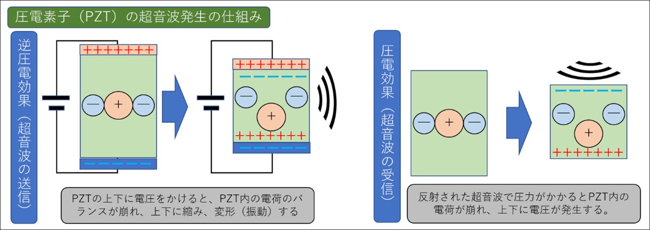 ・PZTは原子構造が非対称なため、物理的な圧力をかけると結晶内の電荷のバランスが崩れ上下に電圧が発生する(圧電効果)。逆に、PZTに電圧をかけると電荷のバランスが崩れ結晶が変形する。この逆圧電効果を利用して、プラスとマイナスの電圧が周期的に変化する交流電流を流すと、PZTは高速で変形(振動)し、PZTに接する周囲の分子(空気、水、金属など)が交互に圧縮・希薄され、超音波が形成される(超音波の送信)