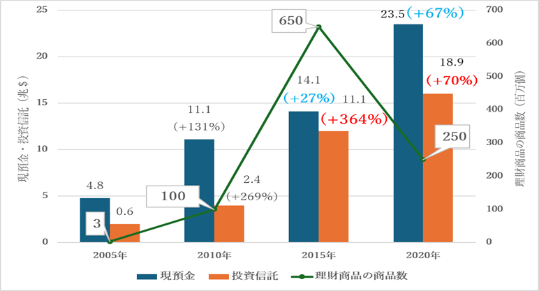 理財商品の商品数を見ると、2015年の6.5億個をピークに、2020年は2.5億個と急激に減少している。前半に大きく伸び、後半が鈍化する動きは、投資信託の伸び率と連動している。