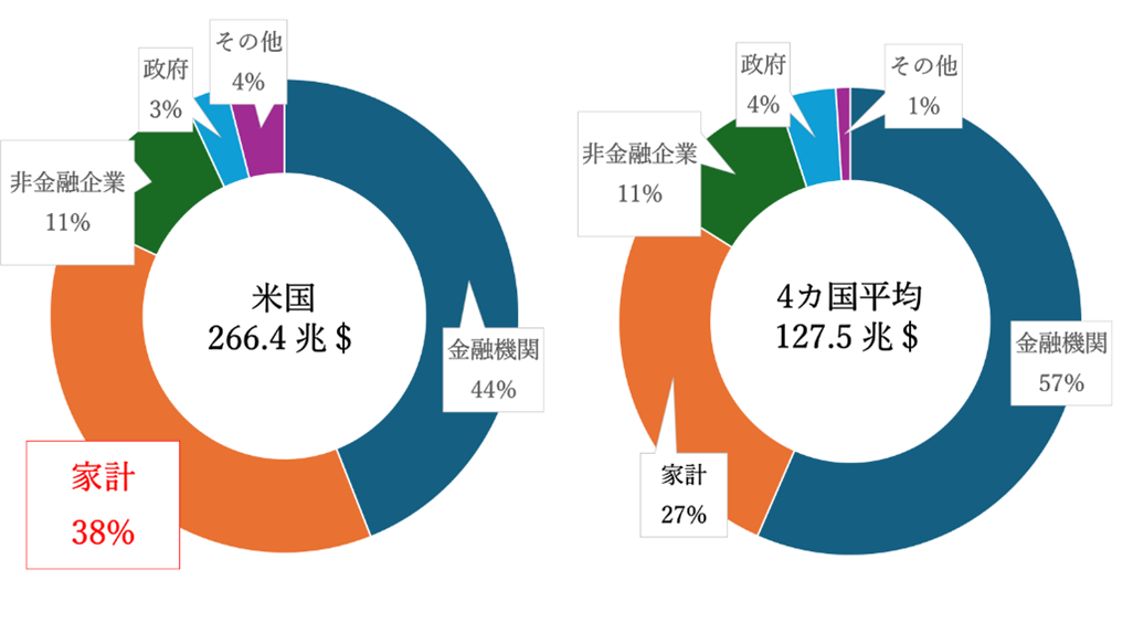 米国における金融資産のセクター別保有割合では、家計の割合が相対的に高い。4か国平均では家計の保有割合は27%にとどまる。一方で米国では38%を占め、家計の存在感が大きく、自由主義経済が最も発達した米国の特徴を反映している。