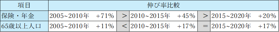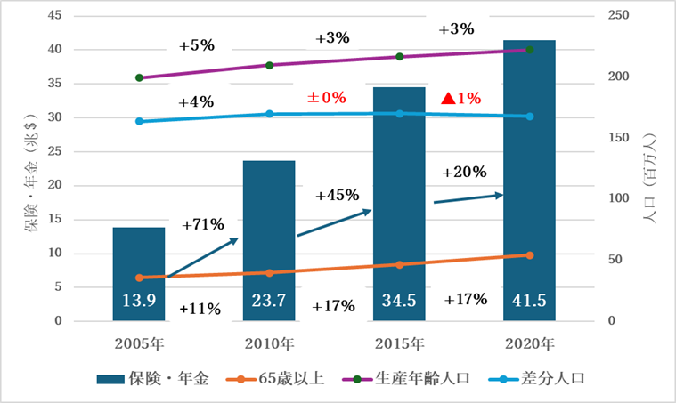 ①生産年齢人口は継続して伸びているが、それを上回るペースで65歳以上の人口が伸びており、両者の差分は2010年以降縮小傾向にある。これに伴い、保険・年金資産の伸び率は、2005年~2010年の+71%をピークに伸び率は縮小傾向にある。