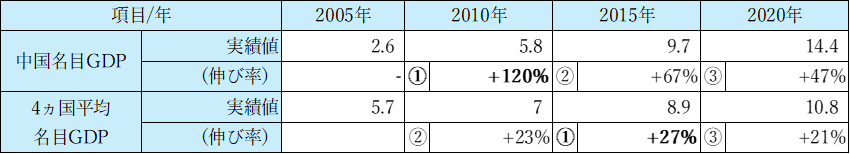 中国と4か国平均の名目GDPはいずれも増加傾向にあるが、伸び率の大きさや最も伸びを示す時期は異なる。4か国平均はリーマン・ショック後の回復期(2010〜2015年)の伸び率が最大であるのに対し、中国はリーマン・ショックが発生した期間(2005〜2010年)にピークを迎え、その後は伸びが緩やかになっている。