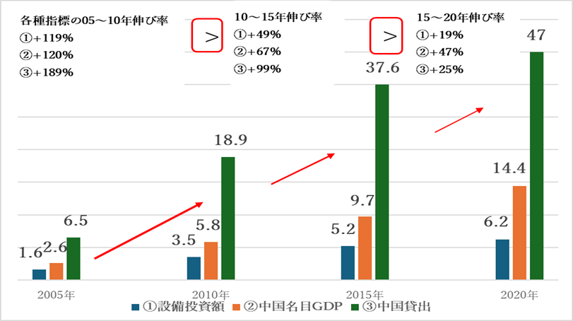 中国の貸し出し・名目GDP・設備投資額は2005年以降右肩上がりで増加している。また、伸び率を見ると全ての指標で2005~2010年がピークで以降は鈍化傾向にある。