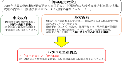 中国の名目GDPは、4か国平均とは異なるタイミングで大きく伸び、貸し出しが膨張している背景には、2008年の世界金融危機後に中国政府が実施した国策の「4兆元政策」による影響がある。