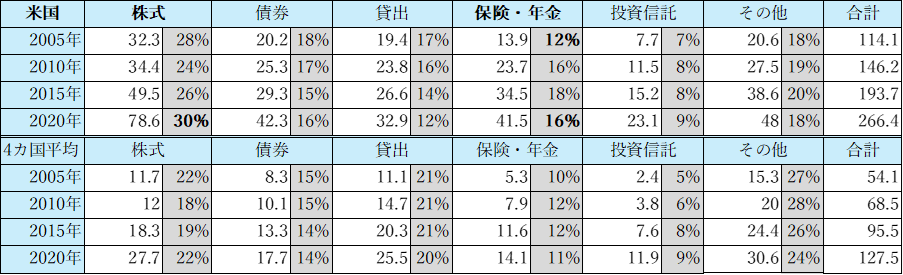 表8 米国と4か国平均の家計における種類別金融資産構成比の推移