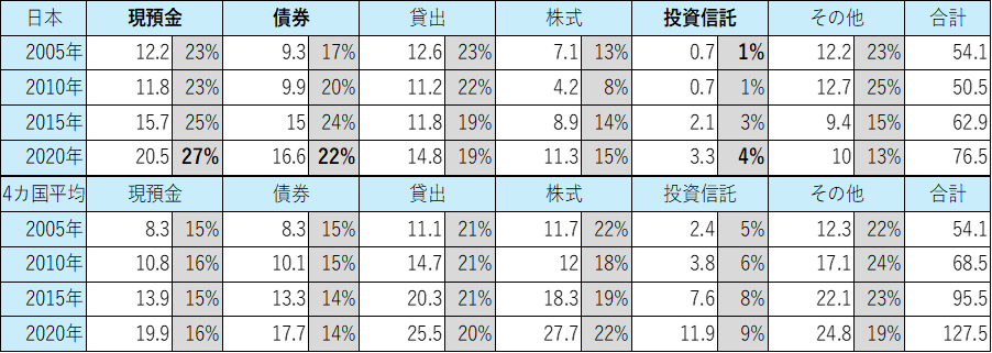 日本は、現預金が27%、債券が22%とこれら2つの資産が全体の49%を占めており、4か国平均と比べて比較的安全と認識される資産への偏重が際立つ。一方で、投資信託の構成比は2005年から2020年にかけて+3%増加しており、性質の異なる資産へのシフトも一部で見られる。