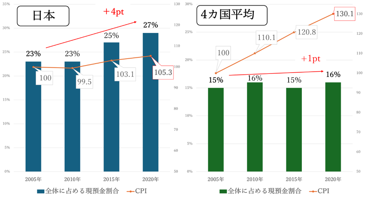 ①日本は2005年時点で金融資産全体に占める現預金の割合が23%と4か国平均と比較して高い。さらに2020年にかけてその割合は+4pt増加した。一方で、4か国平均は+1ptの増加にとどまっており両者には明確な差がある。