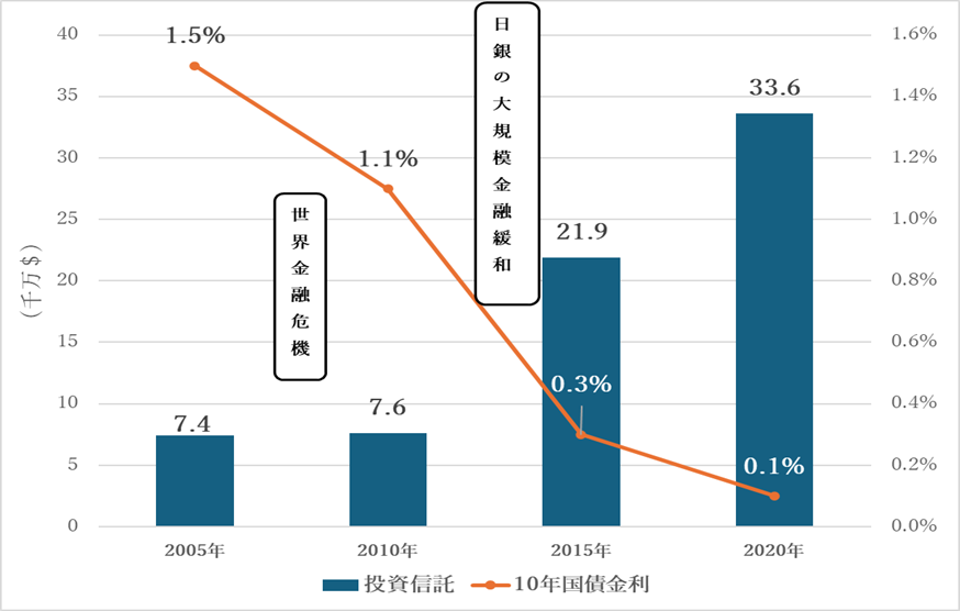 投資信託の資産残高は右肩上がりで増加している一方、10年国債金利は右肩下がりで低下している。特に日本銀行による大規模金融緩和が進んだ2010~2015年には、両者は対照的な動きを顕著に示している。