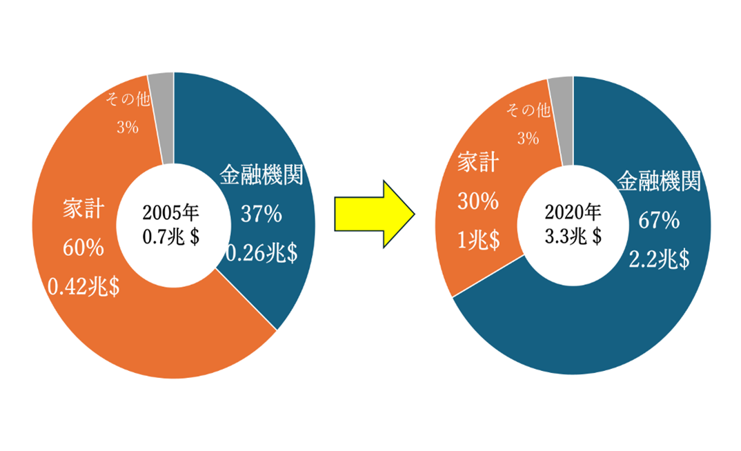 2005年から2020年にかけて、投資信託残高は約4.7倍に拡大し、金融機関・家計の両方で保有残高が伸びた。なかでも金融機関の伸びが顕著で、最大の保有セクターは家計から金融機関へと移った。