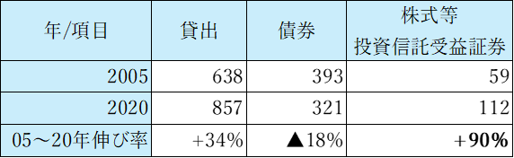 ④2005年から2020年にかけて、預金取扱金融機関における株式等投資信託受益証券残高の伸びに比べ、貸出残高の伸びは緩やかである。これは、長期の低金利環境下で、日本の銀行の収益構造に変化が生じてきたことを示唆している。
