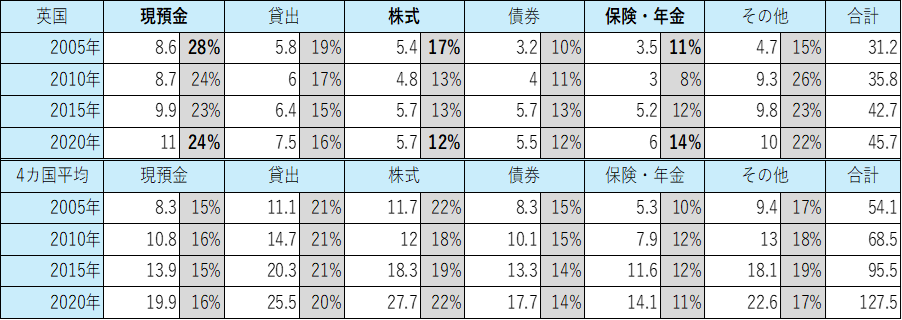 表14 英国の主要種類別金融資産推移(実績値:兆$、金融資産全体に占める割合:%)