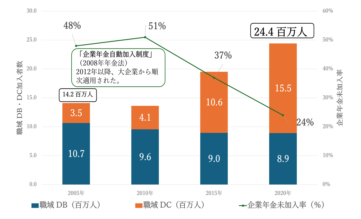 ②種類別に見ると、2005年から2020年にかけて、職域年金は確定給付型(DB)から確定拠出型(DC)へと主流が移行している。DCへの移行が進んだ背景には、DBが企業にとって運用責任や給付保証などの負担が大きく、負担の軽減という意図が要因の一つ。