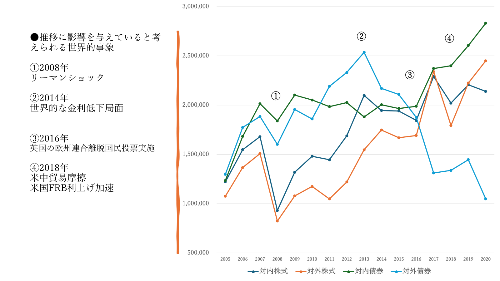 ③背景には、2013年に日本銀行が導入した異次元緩和による長期金利の急低下があり、国債中心であった機関投資家の運用は、利回り確保を目的に多様な資産への分散投資(投資信託など)へと移行しつつあることがうかがえる。