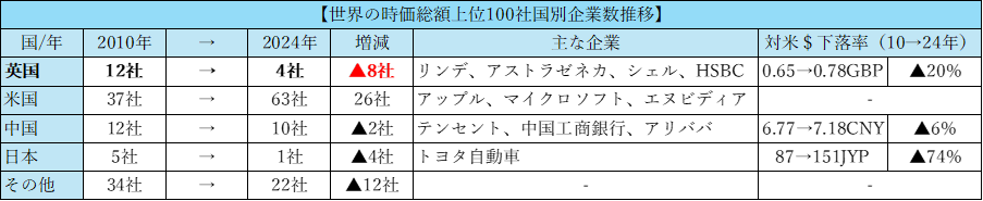 ①世界の時価総額上位100社における英国企業数は、2010年から2024年にかけて▲8社(アングロ・アメリカン、BHPビリトン、リオ・ティント〈鉱業〉、BGグループ、BP〈エネルギー〉、ブリティッシュ・アメリカン・タバコ〈消費財〉、グラクソスミスクライン〈医療品・バイオテクノロジー〉、ボーダフォン〈通信〉)減少、主要4か国の中で最も減少。