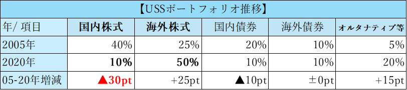 ①USSは英国最大級の年金基金の1つであり、2005年から2020年にかけて国内株式の保有比率を▲30pt減らす一方、海外株式は+25pt増やした。その結果、海外株式の比率が国内株式を追い抜き、2020年時点では両者の差が40ptに達している。