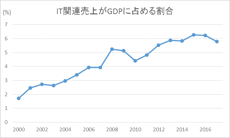 インドIT産業の特徴は、ハードウェア(PC、周辺機器など)よりも圧倒的にITサービス(ソフトウェア)の売上比重が高いことである。GDPに占める割合の推移から見ても、IT産業は堅実にインド経済への貢献度を高めている。IT産業が技能集約的かつ付加価値、生産性の高い産業であることを勘案すると、一層インド経済を牽引していくことが出来る産業である。