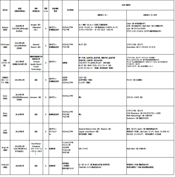 ①開発主体が自動車メーカーとなっているのは「GM Cruise」「Argo AI」2社のみで、残り7社はいずれもIT企業、新興企業が開発主体となっている。IT・新興企業は自動車メーカーなどの出資提携を受け、自社の自動運転システムを自動車メーカーの車に搭載し自動運転開発を進めている。
