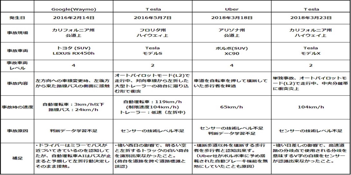 Google社(Waymo)の事故では「バスが止まるであろう」と自動運転特化型AIが判断(推測)した後、左折行動を行った為接触事故が発生。(表4)