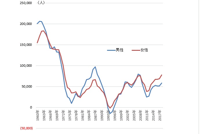 最近こそ女性の転入数(グロス)も着実に増加しているが、それでも遡及可能な1958年以降、女性が男性を上回った年はない。