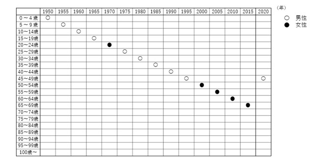 (参考1)日本の人口の最大勢力推移(年齢5歳階級別、1950~2020年)