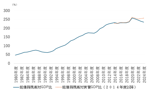 ちなみに、名目GDPに代え、実質GDPを分母に総債務残高比を計算してみると、同比率は低下しておらず、名目GDP比の低下は物価上昇の反映であることが分かる(前掲参考2参照)。
